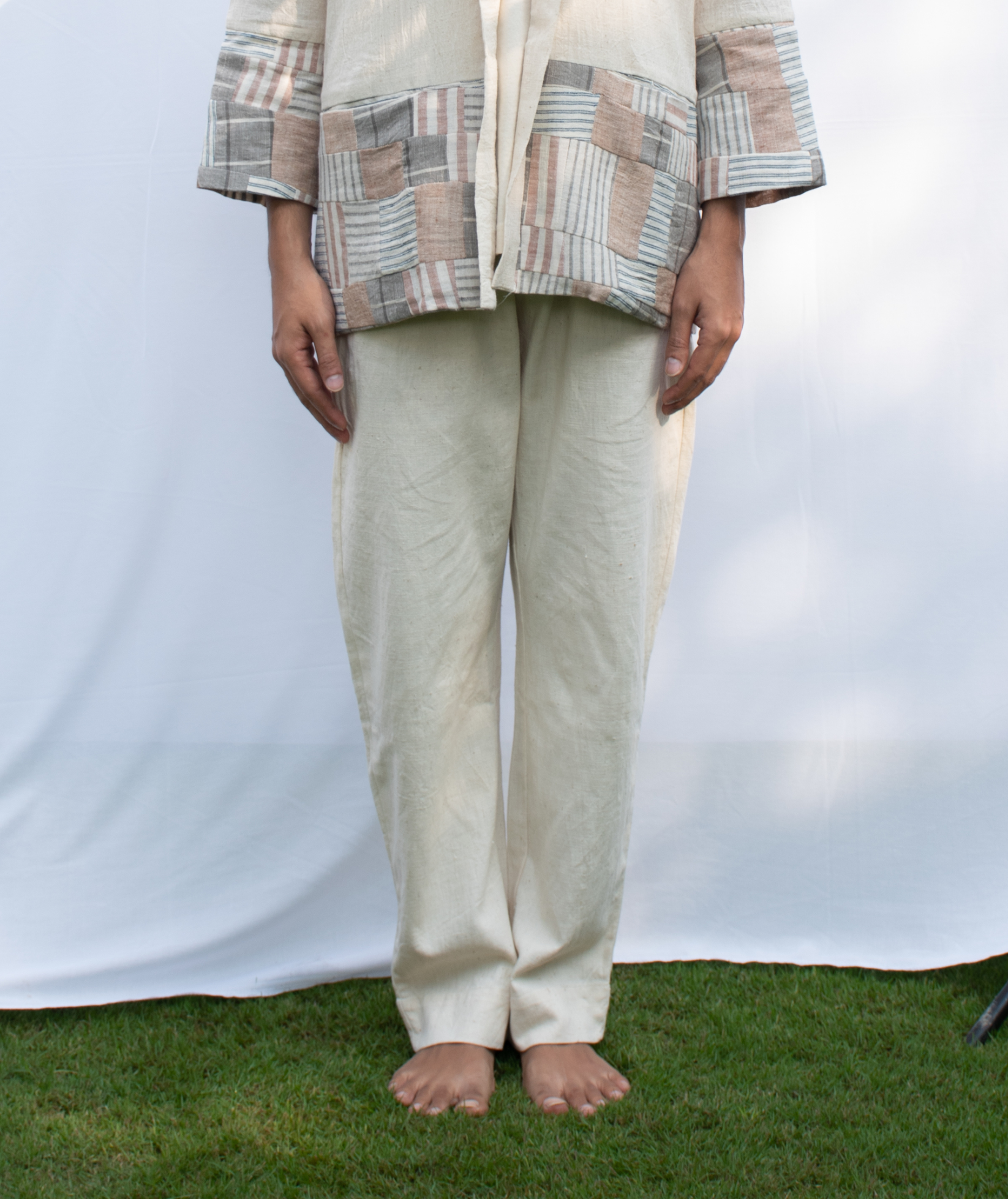 Description:  Handwoven zero-dyed ecru straight drawstring pants made from organic cotton, with patchwork pockets.