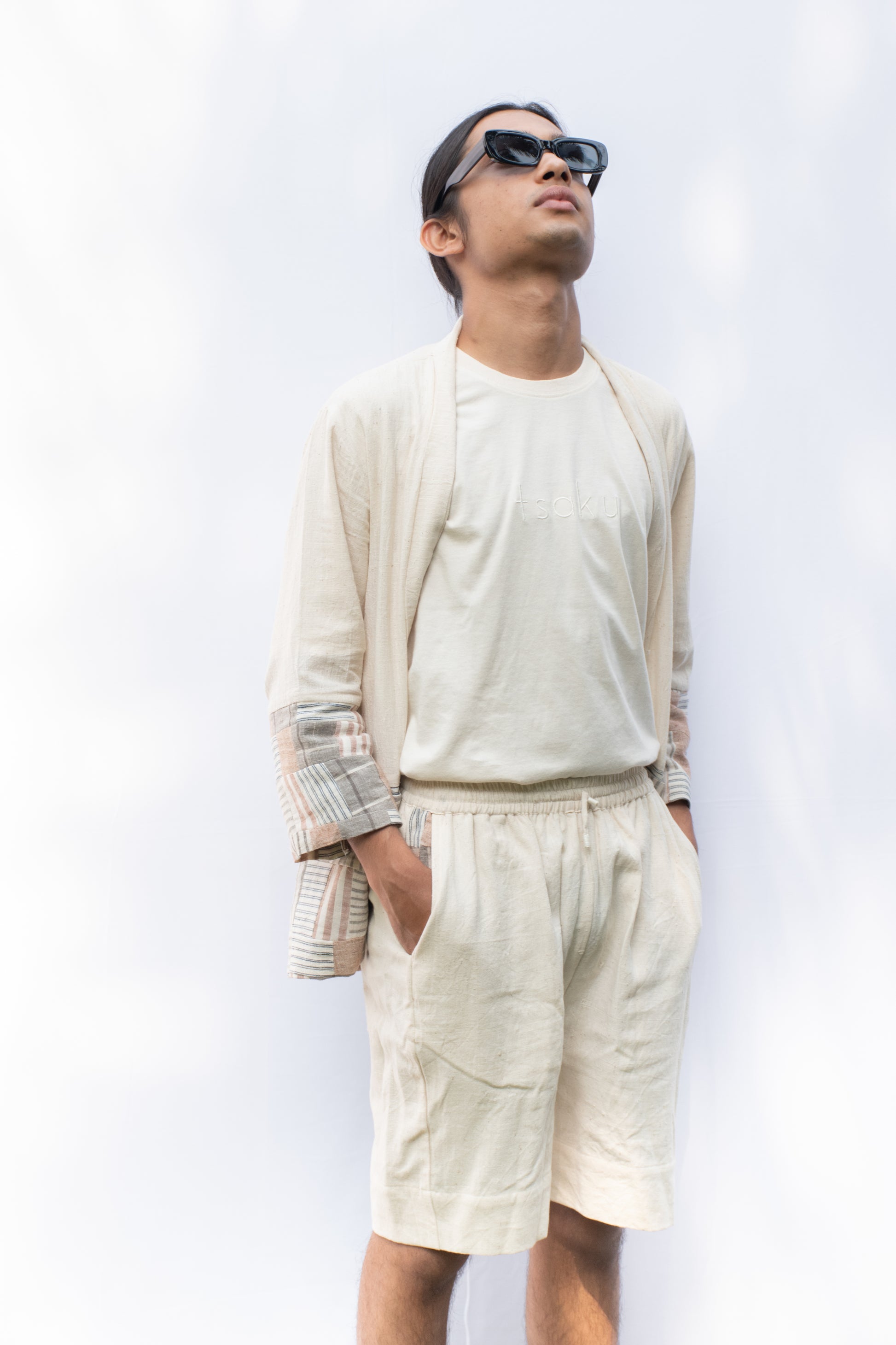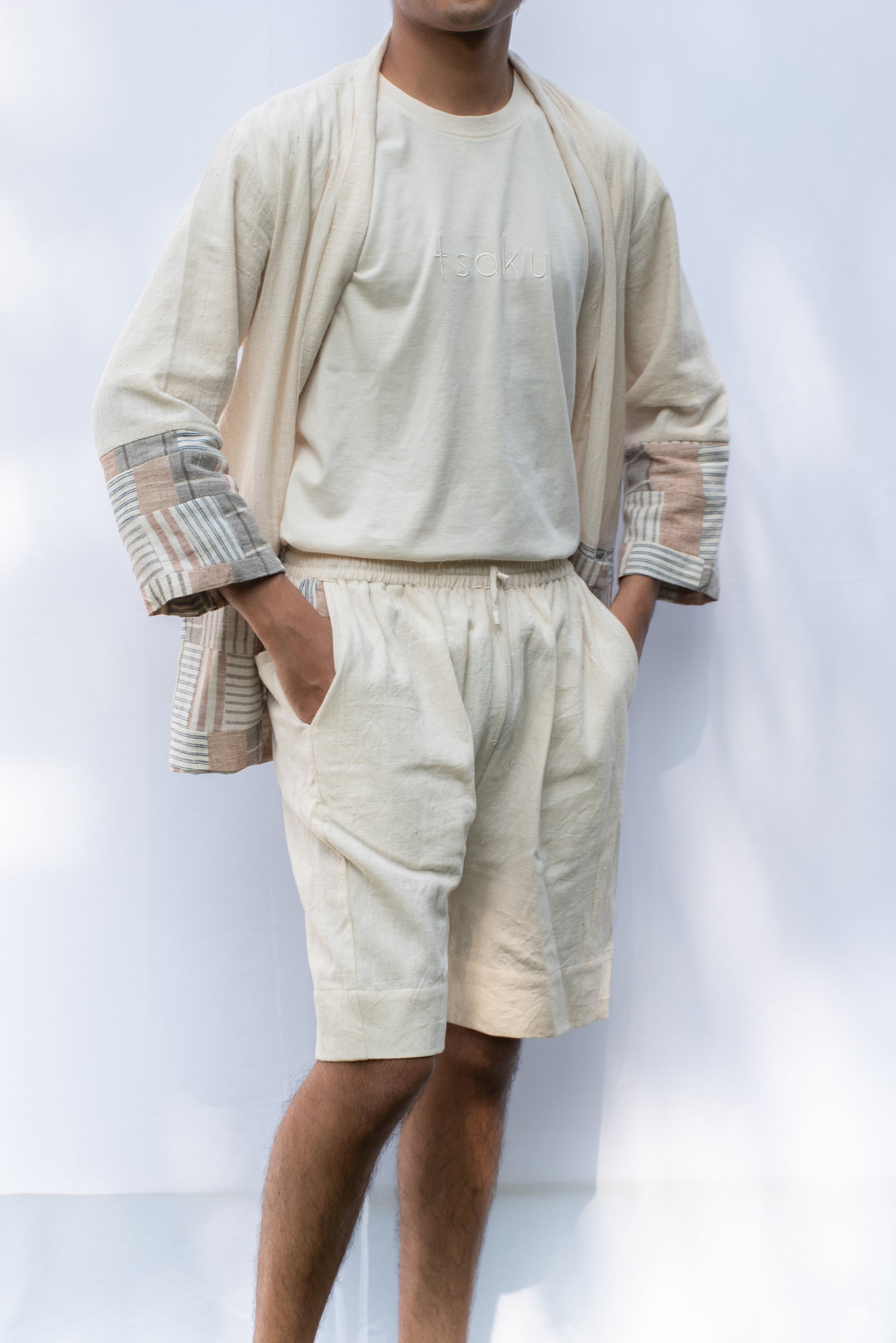 Description: Handwoven zero-dyed ecru drawstring shorts made from organic cotton with patchwork pockets.